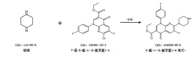 1.通过哌嗪和7-氯-6-氟-1-(4-氟苯基)-4-氧代-1,4-二氢-1,8-萘啶-3-羧酸乙酯合成6-氟-1-(4-氟苯基)-4-氧代-7-(哌嗪-1-基)-1,4-二氢-1,8-萘啶-3-羧酸乙酯,收率约63%;