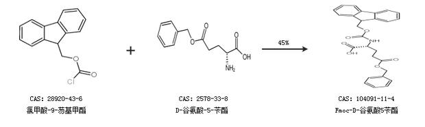 1.通过氯甲酸-9-芴基甲酯和D-谷氨酸-5-苄酯合成Fmoc-D-谷氨酸5苄酯,收率约45%;