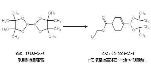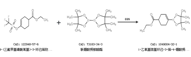1.通过4-(三氟甲基磺酰氧基)-3-环己烯羧酸乙酯和联硼酸频那醇酯合成1-乙氧基羰基环己-3-烯-4-硼酸频哪醇酯,收率约69%;