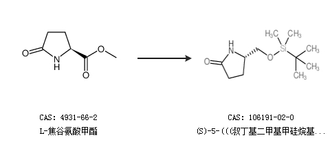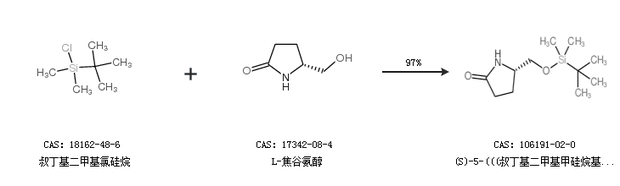 1.通过叔丁基二甲基氯硅烷和L-焦谷氨醇合成(S)-5-(((叔丁基二甲基甲硅烷基)氧基)甲基)吡咯烷-2-酮,收率约97%;