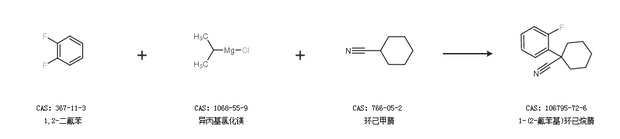 1.通过1,2-二氟苯、异丙基氯化镁和环己甲腈合成1-(2-氟苯基)环已烷腈