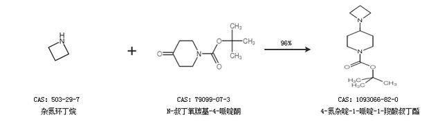 1.通过杂氮环丁烷和N-叔丁氧羰基-4-哌啶酮合成4-氮杂啶-1-哌啶-1-羧酸叔丁酯,收率约96%;
