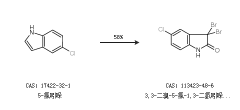 2.通过5-氯吲哚合成3,3-二溴-5-氯-1,3-二氢吲哚-2-酮,收率约58%;