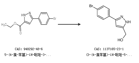 1.通过5-(4-溴-苯基)-1H-吡唑-3-羧酸乙酯合成(3-(4-溴苯基)-1H-吡唑-5-基)甲醇