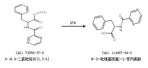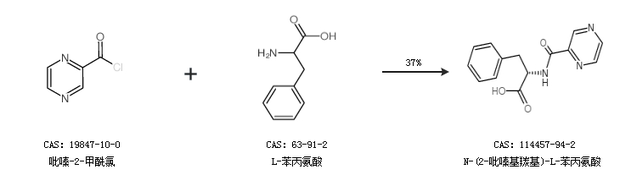 1.通过吡嗪-2-甲酰氯和L-苯丙氨酸合成N-(2-吡嗪基羰基)-L-苯丙氨酸,收率约37%;