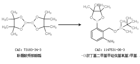 1.通过联硼酸频那醇酯合成2-((叔丁基二甲基甲硅烷基氧基)甲基)-3-(4,4,5,5-四甲基-1,3,2-二噁硼烷-2-基)苯胺