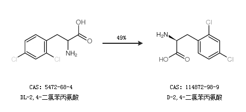 1.通过DL-2,4-二氯苯丙氨酸合成D-2,4-二氯苯丙氨酸,收率约49%;