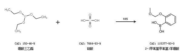 1.通过硼酸三乙酯和硫酸合成2-(甲氧基甲氧基)苯硼酸,收率约44%;