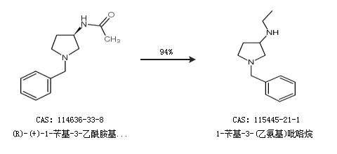 1.通过(R)-(+)-1-苄基-3-乙酰胺基吡咯烷合成1-苄基-3-(乙氨基)吡咯烷,收率约94%;