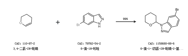 1.通过3,4-二氢-2H-吡喃和6-溴-1H-吲唑合成6-溴-1-(四氢-2H-吡喃-2-基)-1H-吲唑,收率约99%;