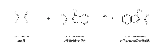 2.通过草酰氯和1-甲基吲哚-2-甲酸合成1-甲基-1H-吲哚-2-羰酰氯,收率约98%;