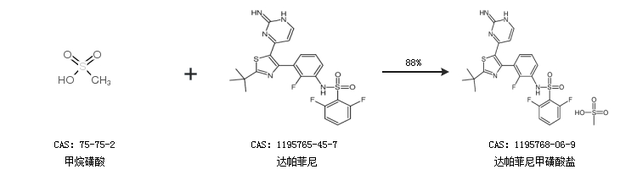 1.通过甲烷磺酸和达帕菲尼合成达帕菲尼甲磺酸盐,收率约88%;
