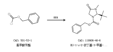 1.通过氯甲酸苄酯合成(R)-1-z-2-叔丁基-3-甲基-4-咪唑啉酮,收率约86%;