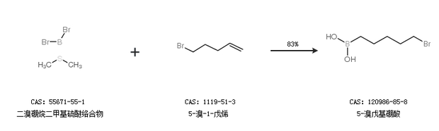 1.通过二溴硼烷二甲基硫醚络合物和5-溴-1-戊烯合成5-溴戊基硼酸,收率约83%;