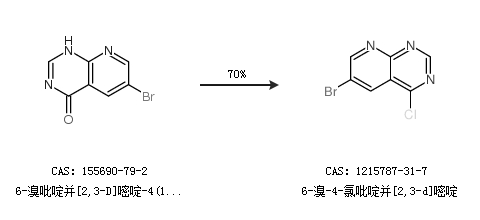 1.通过6-溴吡啶并[2,3-D]嘧啶-4(1H)-酮合成6-溴-4-氯吡啶并[2,3-d]嘧啶,收率约70%;