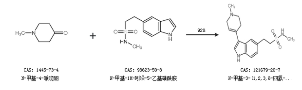 1.通过N-甲基-4-哌啶酮和N-甲基-1H-吲哚-5-乙基磺酰胺合成N-甲基-3-(1,2,3,6-四氢-1-甲基-4-吡啶)-1H-吲哚-5-乙烷磺酰胺,收率约92%;