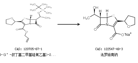 中文别名 法罗培南(钠)(二倍半水合物);(+)-(5R,6S)-6-[(R)-1-羟基乙基]-7-氧代-3-[(R)-2-四氢呋喃基]-4-硫杂-1-氮杂双环[3.2.0]庚-2-烯-2-羧酸钠;