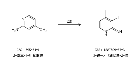 1.通过2-氨基-4-甲基吡啶合成3-碘-4-甲基吡啶-2-胺,收率约12%;