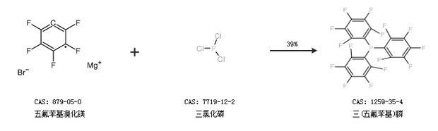 2.通过五氟苯基溴化镁和三氯化磷合成三(五氟苯基)膦,收率约39%;
