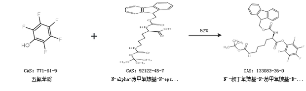 1.通过五氟苯酚和N-alpha-芴甲氧羰基-N-epsilon-叔丁氧羰基-D-赖氨酸合成N''-叔丁氧羰基-N-芴甲氧羰基-D-赖氨酸五氟苯基酯,收率约52%;