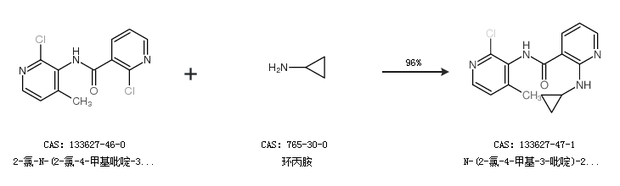 2.通过2-氯-N-(2-氯-4-甲基吡啶-3-基)烟酰胺和环丙胺合成N-(2-氯-4-甲基-3-吡啶)-2-环丙氨基-3-吡啶甲酰胺,收率约96%;
