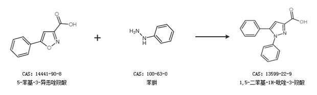 2.通过5-苯基-3-异恶唑羧酸和苯肼合成1,5-二苯基-1H-吡唑-3-羧酸