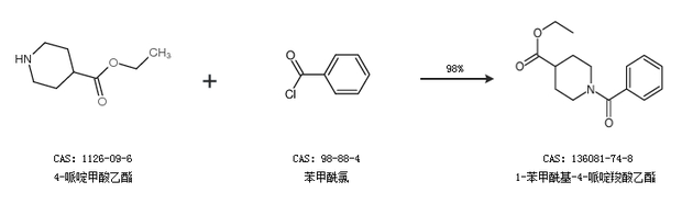 1.通过4-哌啶甲酸乙酯和苯甲酰氯合成1-苯甲酰基-4-哌啶羧酸乙酯,收率约98%;