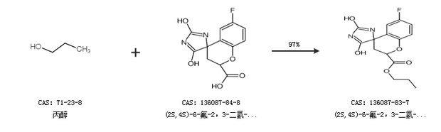 1.通过丙醇和(2S,4S)-6-氟-2,3-二氢-2’,5’-二氧螺(4H-1-苯并吡喃-4,4’-咪唑烷)-2-羧酸合成(2S,4S)-6-氟-2,3-二氢-2’,5’-二氧螺(4H-1-苯并吡喃-4,4’-咪唑烷)-2-羧酸正丙酯,收率约97%;
