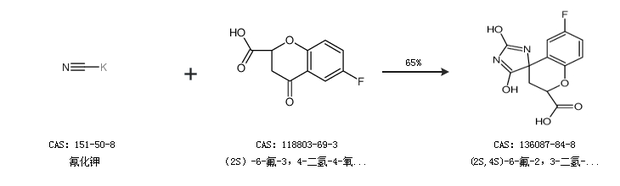 1.通过氰化钾和(2S)-6-氟-3,4-二氢-4-氧代-2H-1-苯并吡喃-2-甲酸合成(2S,4S)-6-氟-2,3-二氢-2’,5’-二氧螺(4H-1-苯并吡喃-4,4’-咪唑烷)-2-羧酸,收率约65%;
