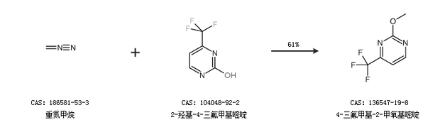 1.通过重氮甲烷和2-羟基-4-三氟甲基嘧啶合成4-三氟甲基-2-甲氧基嘧啶,收率约61%;