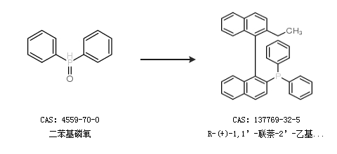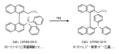 1.通过(S)-(-)-2-(二苯基磷酰)-2’-乙基-1,1’-联萘合成R-(+)-1,1’-联萘-2’-乙基-2-二苯膦,收率约79%;