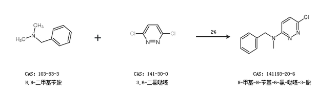 1.通过N,N-二甲基苄胺和3,6-二氯哒嗪合成N-甲基-N-苄基-6-氯-哒嗪-3-胺,收率约2%;