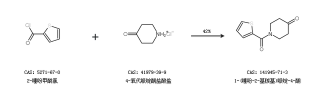 2.通过2-噻吩甲酰氯和4-氧代哌啶酮盐酸盐合成1-(噻吩-2-基羰基)哌啶-4-酮,收率约42%;
