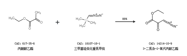 2.通过丙酮酸乙酯和三甲基硅烷化重氮甲烷合成3-二氮杂-2-氧代丙酸乙酯,收率约88%;
