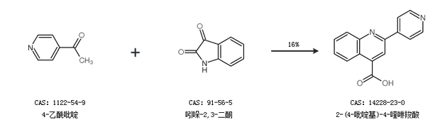 1.通过4-乙酰吡啶和吲哚-2,3-二酮合成2-(4-吡啶基)-4-喹啉羧酸,收率约16%;