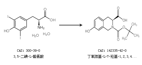 2.通过3,5-二碘-L-酪氨酸合成丁氧羰基-L-7-羟基-1,2,3,4-四氢化异喹啉-3-羧酸