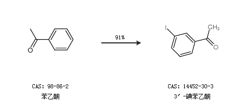2.通过苯乙酮合成3′-碘苯乙酮,收率约91%;