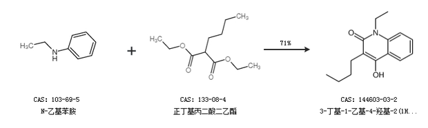 1.通过N-乙基苯胺和正丁基丙二酸二乙酯合成3-丁基-1-乙基-4-羟基-2(1H)-喹啉酮,收率约71%;
