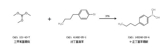 1.通过三甲氧基硼烷和对丁基溴苯合成4-正丁基苯硼酸,收率约37%;