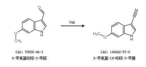 2.通过6-甲氧基吲哚-3-甲醛合成6-甲氧基-1H-吲哚-3-甲腈,收率约74%;