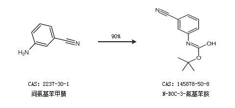 1.通过间氨基苯甲腈合成N-BOC-3-氰基苯胺,收率约90%;