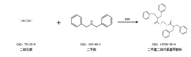1.通过二硫化碳和二苄胺合成二苄基二硫代氨基甲酸锌,收率约69%;