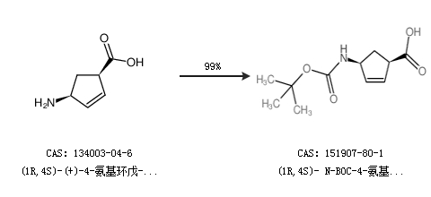 1.通过(1R,4S)-(+)-4-氨基环戊-2-烯甲酸合成(1R,4S)- N-BOC-4-氨基环戊-2-烯甲酸,收率约99%;