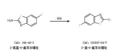 1.通过2-氨基-6-氟苯并噻唑合成2-溴-6-氟苯并噻唑,收率约40%;