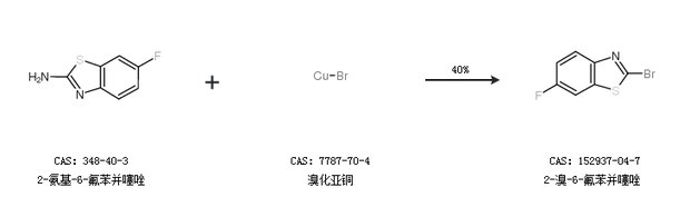 2.通过2-氨基-6-氟苯并噻唑和溴化亚铜合成2-溴-6-氟苯并噻唑,收率约40%;