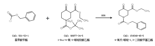 2.通过氯甲酸苄酯和1-Boc-4-氧-3-哌啶羧酸乙酯合成4-氧代-哌啶-1,3-二羧酸苄基乙酯,收率约88%;