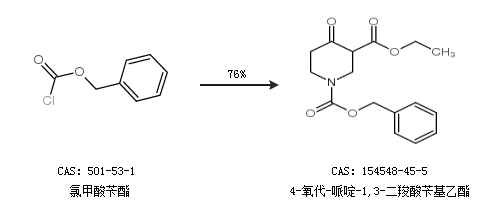 1.通过氯甲酸苄酯合成4-氧代-哌啶-1,3-二羧酸苄基乙酯,收率约76%;