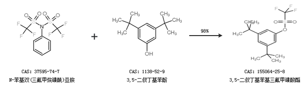 2.通过N-苯基双(三氟甲烷磺酰)亚胺和3,5-二叔丁基苯酚合成3,5-二叔丁基苯基三氟甲磺酸酯,收率约98%;