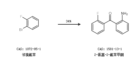 1.通过邻溴氟苯合成2-氨基-2-氟苯甲酮,收率约34%;