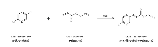 1.通过2-氯-5-碘吡啶和丙烯酸乙酯合成3-(6-氯-3-吡啶)-丙烯酸乙酯,收率约86%;